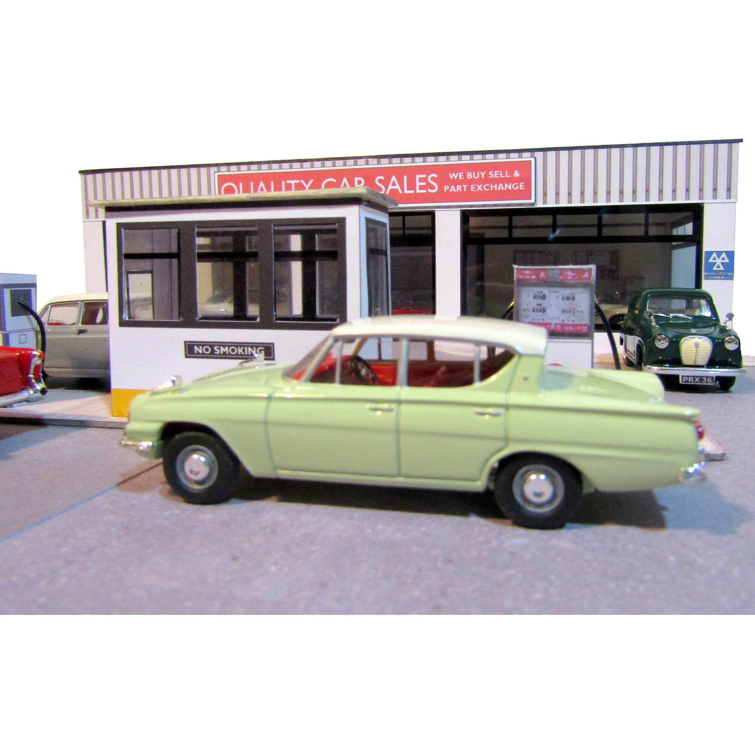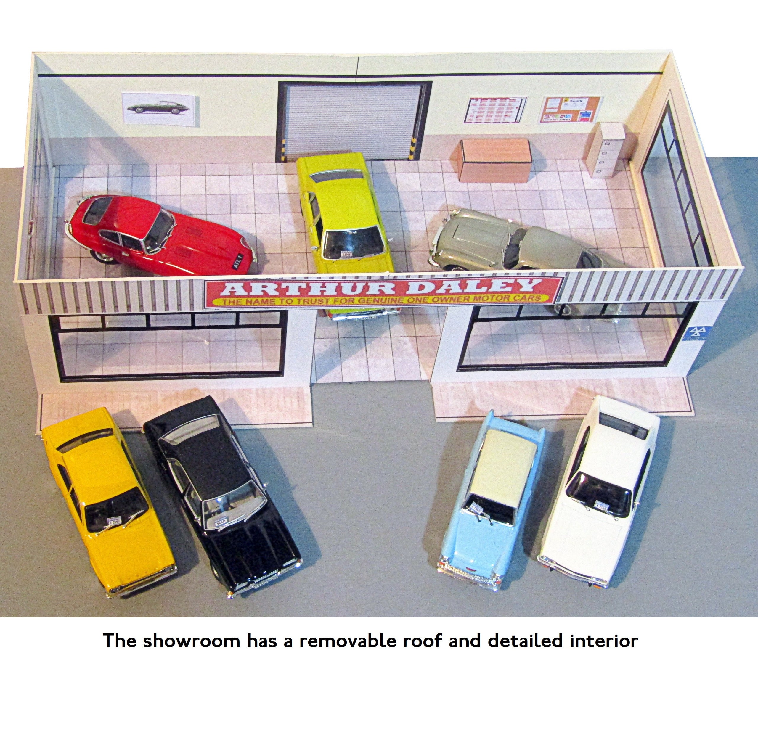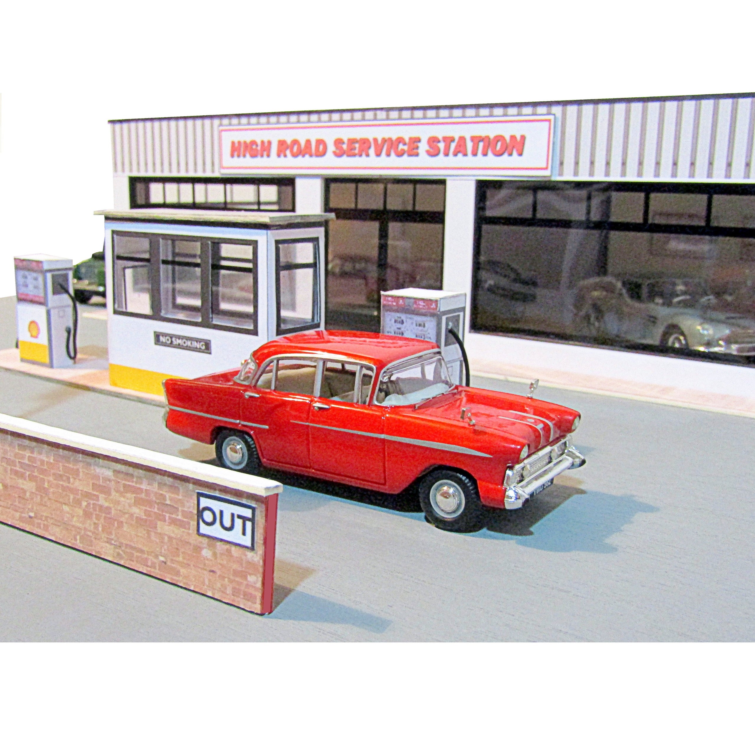 Shell petrol pumps and sign are included as is a forecourt kiosk. The showroom has a removable roof and interior detailing.